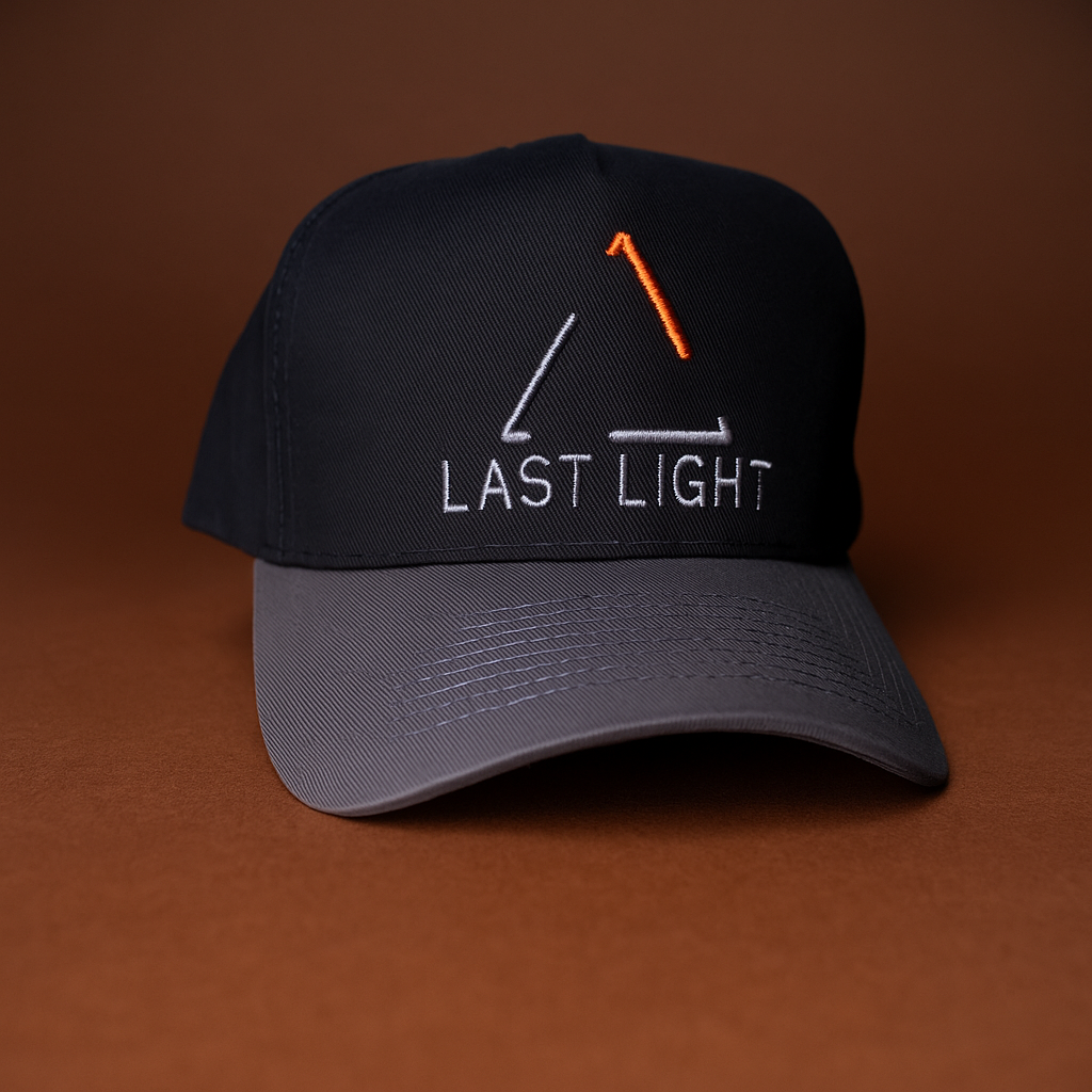 Crafted for versatility and style, this two-tone Last Light cap features a sleek black crown with an embroidered Last Light logo in white and blaze orange. The durable gray bill offers a modern contrast, while structured panels and a curved brim deliver comfort and sun protection—perfect for the outdoors or everyday wear.
